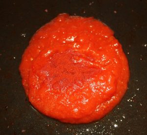 En la misma sartén donde hemos frito la carne, poner dos cucharadas de tomate frito y una cucharadita de pimentón. Dar una vuelta y sacar del fuego para que no se queme.