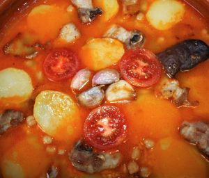 Colocar encima las rodajas de patata, las costillas, la panceta, la morcilla, los tomates partidos por la mitad y en el centro los ajos.