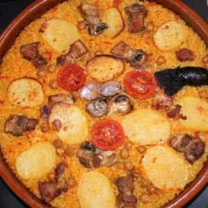 Arroz al horno con costillas de cerdo, panceta, morcilla, tomate y patatas