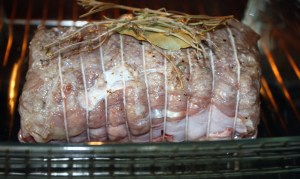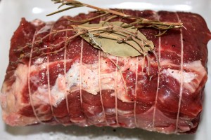 Colocar encima de la carne una hoja de laurel, una rama de tomillo y otra de romero. Podéis ponerlo seco, el que se vende en botes en los supermercados en la sección de especias.