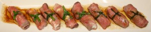 Extender las cortadas de carne. Untar con un poco de mostaza y colocar encima el queso. Para finalizar un poco de pepinillo picado, enrollar y atar con un cebollino. Regar con la salsa y unas gotas de aceite virgen extra.