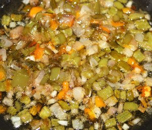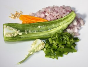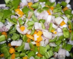 Picar las chalotas, el pimiento italiano, sin semillas y la gundilla también sin semillas.