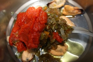 Abrir las clóchinas o mejillones. Ponerlos en una olla caliente sin nada. En cuanto se abran, unos 4 minutos, sacarlos del fuego. Como no vamos a utilizarlos con las valvas, simplemente tenerlos un rato a remojo, frotarlos para eliminar la porquería y cuando ya estén hechos separar la molla de las valvas y eliminar las barbas. Añadirlos a la sartén con el sofrito y las dos cucharadas de tomate, dos minutos y a triturar.