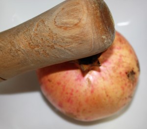 Con un mazo de mortero golpear la granada. También podéis hacerlo con una cuchara.