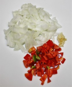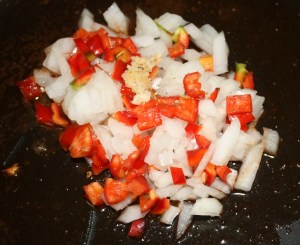 Volver a poner este aceite colado en la misma sartén y añadir el ajo, cebolla y pimiento, todo picado. 10 minutos a fuego suave, tapado para que se vaya pochando. Salpimentar. Mover de vez en cuando para que no se queme, aunque el fuego sea bajo.