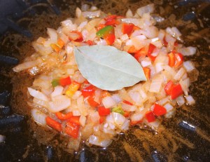 Poner la hoja de laurel y las gotas de tabasco. Seguir moviendo.