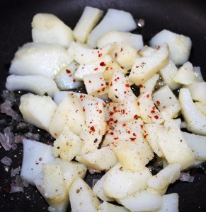 En una sartén poner la patata a dados con el aceite. Salpimentar. Dejar 10 minutos a fuego medio, moviendo para que la patata no se pegue en la sartén.