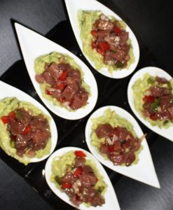 Colocar en las cucharitas, o platos, el guacamole, encima el tartar de atún y añadir una cucharada de la vinagreta de maceración.