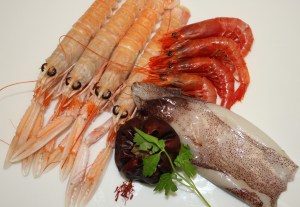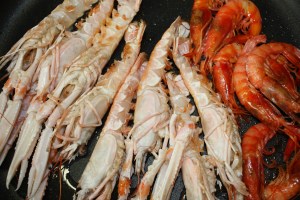 Primero utilizaré una sartén con las cuatro cucharadas de aceite. Sofreír las cigalas y las gambas.