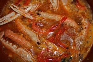 Mezclar y volcar en una cazuela de barro. Inmediatamente añadir el caldo de pescado caliente.