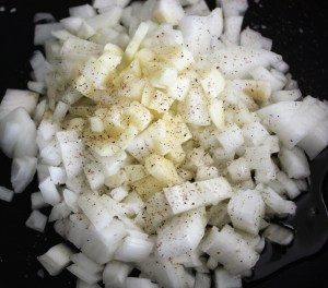 En una sartén con el aceite pochar la cebolla y los ajos picados, 10 minutos a fuego mínimo. Salpimentar.