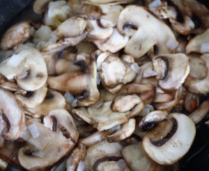 Añadir los champiñones. 5 minutos. Llega el momento de añadir el vaso de caldo o agua. Volver a añadir un poquito de sal. Dejar cociendo a fuego medio 10 minutos más, hasta que el agua se evapore ligeramente y tengamos una crema espesita.