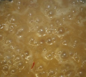 Sacar dos cazos de caldo, a media cocción, 1,5 h, y reservarlos para hacer el risotto.