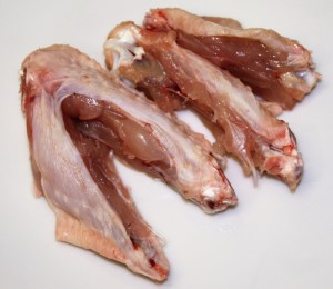 Partir las alitas en dos, cortando justo entre los dos huesos. El hombro no se puede, dejarlo entero.