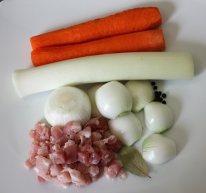Cortar las cebollas, zanahorias y puerro en trozos grandes, ya que luego lo vamos a pasar por el pasapurés, y dorar en la misma sartén, 15 minutos.