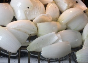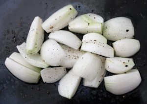 En una fuente de horno, con el aceite, poner las cebollas, cada una en cuatro trozos.