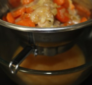Reservar los muslos. Triturar la salsa o pasar por el pasapurés. Previamente habremos exprimido las naranjas, con cuidado de no quemarnos y que no caigan huesos.