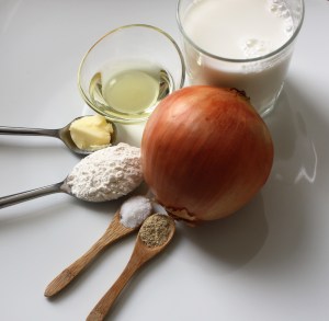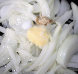 En una sartén con el aceite, mantequilla, sal y pimienta, dorar la cebolla cortada en juliana. En cuanto el aceite esté caliente bajar el fuego al mínimo, tapar y dejar 15 minutos, moviendo de vez en cuando para que no se nos queme.