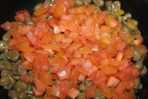 En una sartén con dos cucharadas de aceite dar unas vueltas a las habitas, de bote ya cocidas, y el tomate, salpimentar.