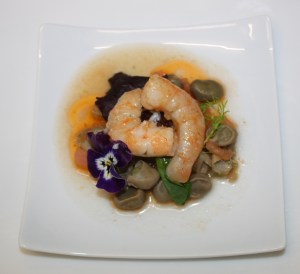 Colocar en el plato los cuerpos de los langostinos que teníamos reservados sobre las verduras y terminar aderezándolos con el aceite y jugo de las cabezas y sal. Decorar con unos germinados o flores.