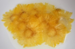 Colocar las láminas de piña en un plato y poner encima el almíbar. Dejar una hora.
