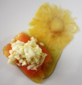 Cortar cada loncha de salmón por la mitad. Poner encima de cada mitad un rodaja de piña macerada con el almíbar y enrollar. Para montar el plato colocamos los rollitos y sobre ellos un poco de la vinagreta. Decoramos con una rodaja de piña.