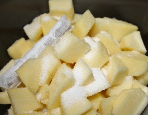 Colocarlas en un bol con el azúcar y la canela. Mezclar.