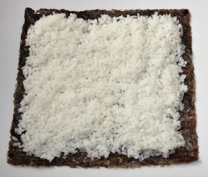 Vamos a hacer un sándwich con arroz para sushi , alga nori y salmón ahumado.