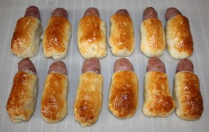 Enrollar las longanizas con el hojaldre, dejando el extremo redondo sin envolver.