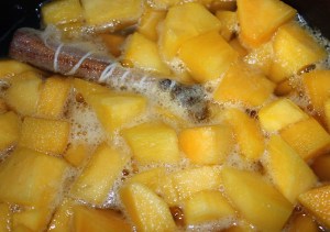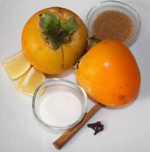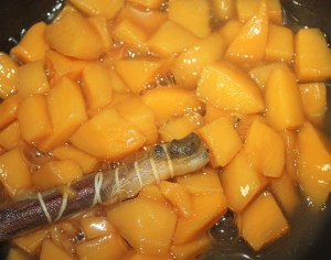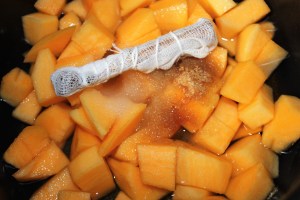 En una sartén poner todos los ingredientes: dados de caqui, azúcares, gasa con la canela y clavos, zumo de limón y agua.