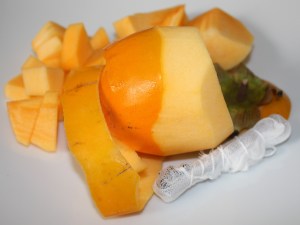 Pelar los caquis, eliminando la parte superior. Cortar en dados.