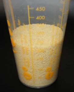 Normalmente hay que poner la misma cantidad de sémola que de agua. Medir la sémola en un vaso.
