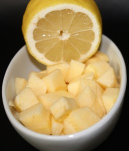 Pelar la manzana, cortar en dados y añadirle el zumo de limón para que no se oscurezca.