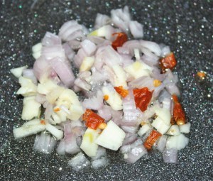 Picar la chalota, el ajo y la guindilla sin semillas. Dos minutos en una sartén con dos cucharadas de aceite a fuego medio.