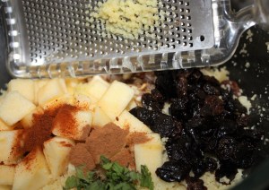 Vamos ya a mezclar todos los ingredientes de la ensalada: en un bol poner el cous cous, manzana, menta cortada en juliana, lo que tenemos reservado en la sartén, las pasas y ciruelas escurridas, un poco de jengibre rallado, piel de un cuarto de limón ( con cuidado de no rallar la parte blanca que amarga ), vinagre, aceite virgen y sal. Mezclar todo bien y dejarlo un poco en la nevera para que todos los ingredientes se integren.