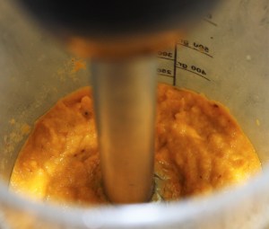 Sacar las verduras de la fuente de horno con un poco del caldo que hemos añadido y triturarlas. Si se queda muy espesa poner un poco más de caldo.
