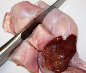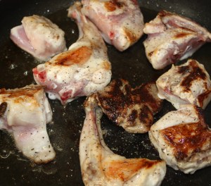 En la misma sartén donde hemos frito el bogavante, añadir las otras 4 cucharadas de aceite y freír el conejo. Salpimentarlo. También el hígado y el ajo que vamos a utilizar para el majado. 5 minutos a fuego fuerte. Reservar el hígado y el ajo para el majado.
