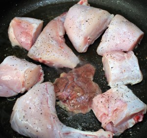 En una sartén con cuatro cucharadas de aceite sofreírlo, muy poco, vuelta y vuelta, en cuanto la carne coja el color blanco sacarlo del fuego y reservarlo.