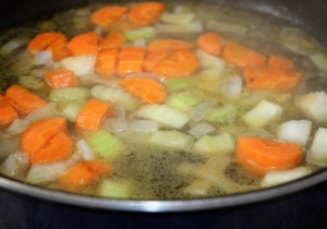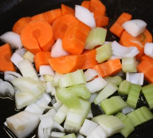 Cortar la zanahoria, cebolla y puerro en mirepoix.