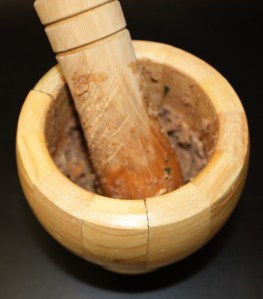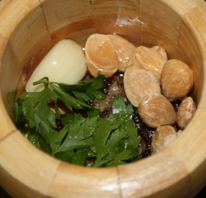 En un mortero majar el hígado frito, ajo frito, almendras, perejil y una pizca de sal.