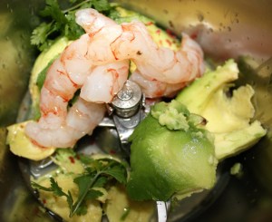 Triturar el aguacate con 4 gambas ( reservar dos ), el zumo de la lima, leche, pimienta y sal.