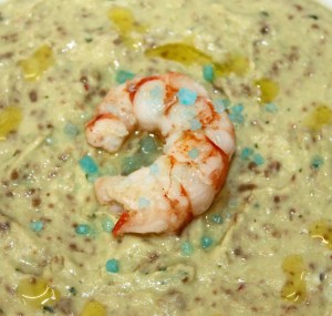 Colocar en un plato hondo la crema de aguacate, encima las gambas, sal y unas gotas de aceite virgen extra.