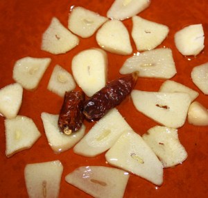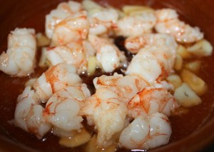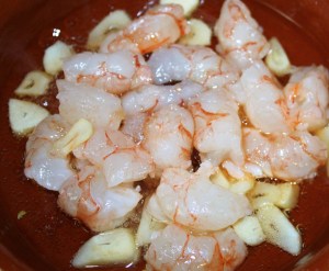 En una cazuela de barro individual poner el aceite, ajo laminado y guindillas. A fuego bajo 5 minutos. El ajo debe quedar pochado pero no dorado ya que después con las gambas se dorará a fuego fuerte.