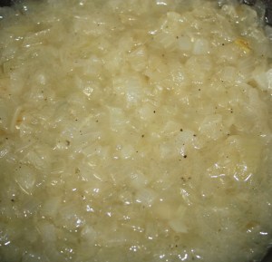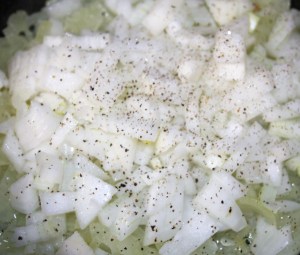 En una sartén con el aceite poner la cebolla, troceada pequeña, con media cucharadita de sal. 5 minutos a fuego medio. Remover de vez en cuando para que no se queme.