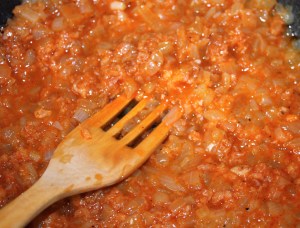 Añadir la cebolla y sobrasada. Mezclar bien.