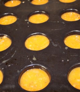 Colocar unos moldes de silicona sobre la bandeja de horno. Rellenar con la mezcla de huevo, cebolla y sobrasada, no hasta el borde porque hay que tener en cuenta que en el horno el huevo sube.