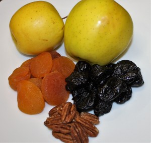 Colar los orejones y las ciruelas. Añadirles una manzana pelada y cortada en trozos, y las nueces enteras. Este será nuestro relleno. Reservar el líquido.