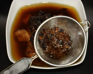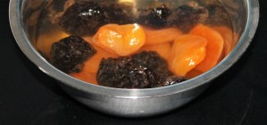 Poner a remojo, con el jerez y el agua, los orejones y las ciruelas para que se hidraten.