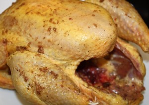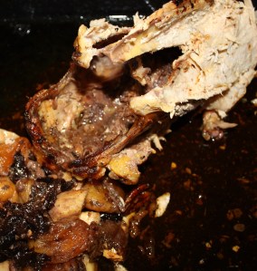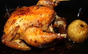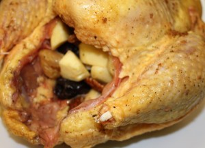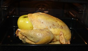 Dar la vuelta a la pularda con cuidado. La manzana se caerá pero el relleno si lo habéis apretado bastante no, de todas formas colocar la manzana cerca de la abertura por si se quiere salir algo del relleno que lo impida. Untar con el resto del majado y regar con la otra mitad del líquido reservado.