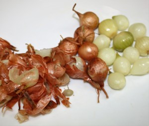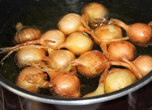 Mientras tanto escaldar las cebollitas. Poner un cazo a fuego fuerte con agua y una cucharadita de sal. Cuando el agua comience a hervir introducirlas 2 minutos. De esta manera nos será mucho más fácil pelarlas.